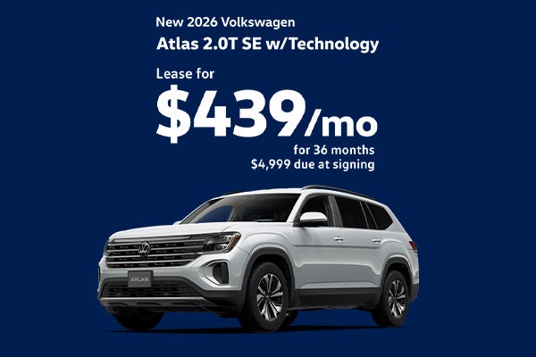 *Ex: 2026 Volkswagen Atlas 2.0T SE Tech. MSRP: $43,730. Lease for $439/month for 36 months. 10,000 miles per year. $4,999 due at signing. Selling Price: $40,182.02. With approved credit through Volkswagen Financial Services. Not all will qualify. Advertised Price excludes all optional dealer offered items, accessories, or product addendums optionally selected by the purchaser, dealer document processing fee of $797 per TCA 55-17-114, and state and local taxes, tags, registration and title fees. Advertised prices include factory-installed options installed by the manufacturer and non-optional dealer-installed accessories already installed on the vehicle by the dealer at time of advertising. See dealer for complete offer details. Offer Expires 03/02/2026.