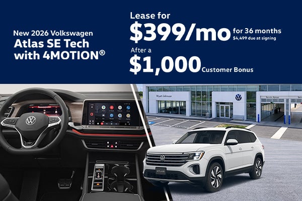 *$4,499 due at signing. Excludes tax, title, license, options and dealer fees. No security deposit. For well-qualified customers.Limited inventory available. State Offer. Offer ends April 30th 2026. Closed end lease financing available through April 30, 2026 for a new, unused 2026 Atlas SE Tech with 4MOTION®, on approved credit to well-qualified customers by Volkswagen Financial Services through participating dealers in MA; CT; NH; RI; VT; ME; MI; OH; DE; PA; NY and NJ. Monthly lease payment based on MSRP of $45,630 and destination charges, less a suggested dealer contribution and application of a $1,000 Customer Bonus resulting in a capitalized cost of $40,263.41. Excludes tax, title, license, options and dealer fees. Amount due at signing includes first month's payment, customer down payment of $3,401, and acquisition fee of $699. Monthly payments total $14,364. Your payment will vary based on dealer contribution and the final negotiated price. At lease end, lessee responsible for disposition fee of $395, $0.20/mile over 30,000 miles and excessive wear and use. Customer Bonus applied towards lease contract when using discounted Volkswagen Financial Services Special Lease program only and is not redeemable for cash. A $395 fee applies if you purchase your lease vehicle. Offer not valid in Puerto Rico. See your participating Volkswagen dealer for details or, for general product information, call 1-800-Drive-VW. ©2026 Volkswagen of America, Inc. Offer expires April 30, 2026.
