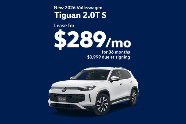 *Ex: 2026 Volkswagen Tiguan 2.0T S. VIN: 3VVCR7RM1TM033917. MSRP: $32,881. Lease for $289/month for 36 months. 10,000 miles per year. $3,999 due at signing. Selling Price: $31,881. With approved credit through Volkswagen Financial Services. Not all will qualify. Advertised Price excludes all optional dealer offered items, accessories, or product addendums optionally selected by the purchaser, dealer document processing fee of $797 per TCA 55-17-114, and state and local taxes, tags, registration and title fees. Advertised prices include factory-installed options installed by the manufacturer and non-optional dealer-installed accessories already installed on the vehicle by the dealer at time of advertising. See dealer for complete offer details. Offer Expires 03/02/2026.