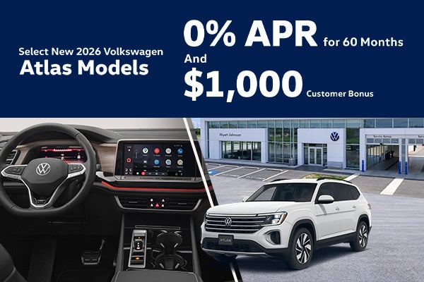 *0% APR, no down payment required, available on new, unused 2026 Atlas models (excludes Atlas Cross Sport) financed by Wells Fargo through participating dealers in IL; IA; MN; SD; WI; ND; IN; GA; AL; SC; TN; MD; NC; VA; WV; ID; MT; TX; HI; AK; MO; NE; KS; AR; OK; LA; MS; KY; NM and WY. Example: For 0% APR, monthly payment for every $1,000 you finance for 60 months is $16.67. Not all customers will qualify for credit approval or advertised APR. Subject to credit approval by Wells Fargo. Offer ends April 30, 2026. **Volkswagen of America, Inc. will apply a $1,000 Customer Bonus when you finance the purchase of a new, unused 2026 Atlas (excludes Atlas Cross Sport) through participating dealers in IL; IA; MN; SD; WI; ND; IN; GA; AL; SC; TN; MD; NC; VA; WV; ID; MT; TX; HI; AK; MO; NE; KS; AR; OK; LA; MS; KY; NM and WY from March 3, 2026 to April 30, 2026. Bonus applied toward the purchase when using Wells Fargo Special APR programs only and is not redeemable for cash. Bonus cannot be redeemed on Fleet or Dealership Sale Program. For both offers: Offer not valid in Puerto Rico. See your participating Volkswagen dealer for details or, for general product information, call 1-800-Drive-VW. ©2026 Volkswagen of America, Inc. If provided, Advertised Price excludes all optional dealer offered items, accessories, or product addendums optionally selected by the purchaser, dealer document processing fee of $797 per TCA 55-17-114, and state and local taxes, tags, registration and title fees. Advertised prices include factory-installed options installed by the manufacturer and non-optional dealer-installed accessories already installed on the vehicle by the dealer at time of advertising. See dealer for complete offer details. Offer expires April 30, 2026.