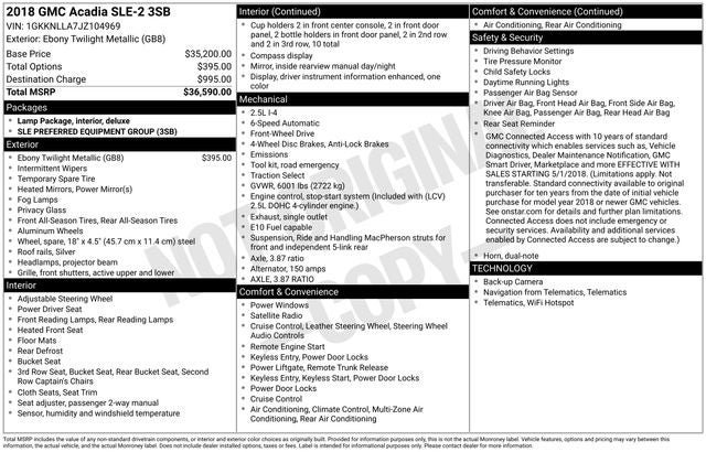 Boasting a striking Ebony Twilight Metallic exterior and a spacious, well-appointed interior, the Acadia SLE-2 is a true head-turner. Equipped with a robust 2.5L 4-Cylinder DGI DOHC VVT engine and a smooth-shifting 6-Speed Automatic transmission, this SUV delivers impressive performance and efficiency, with an EPA-estimated 21 MPG in the city and 26 MPG on the highway.