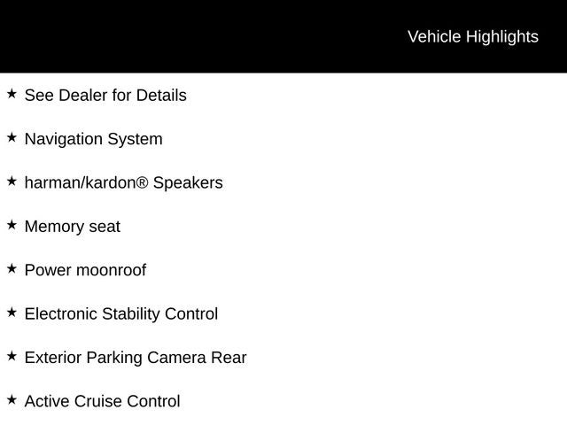 See Dealer for Details, Active Cruise Control, Apple CarPlay & Android Auto, Auto-dimming Rear-View mirror, Electronic Stability Control, Exterior Parking Camera Rear, harman/kardon® Speakers, Heated & Ventilated Front Bucket Seats, Leather Seat Trim, Memory seat, Navigation System, Power moonroof, Wheels: 18 x 8J Machined Finish Alloy.