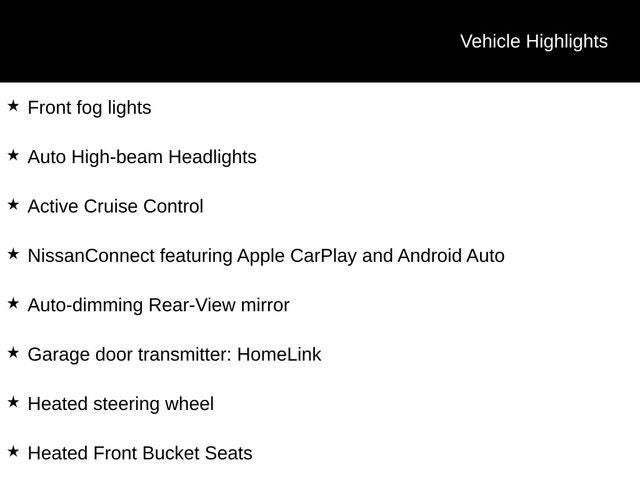 CVT with Xtronic, 19 Alloy Wheels, Active Cruise Control, Auto High-beam Headlights, Auto-dimming Rear-View mirror, Automatic temperature control, Blind Spot Warning, Front dual zone A/C, Front fog lights, Garage door transmitter: HomeLink, Heated Front Bucket Seats, Heated steering wheel, Leather-Appointed Seat Trim, Memory seat, Navigation System, NissanConnect featuring Apple CarPlay and Android Auto, Power moonroof, Radio: AM/FM/HD w/Bose Premium Sound System, Rear Parking Sensors.