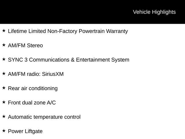 Lifetime Limited Non-Factory Powertrain Warranty, 4WD, Alloy wheels, AM/FM radio: SiriusXM, AM/FM Stereo, Auto High-beam Headlights, Automatic temperature control, Electronic Stability Control, Exterior Parking Camera Rear, FordPass Connect, Front dual zone A/C, Fully automatic headlights, Heated front seats, Power Liftgate, Rear air conditioning, SYNC 3 Communications & Entertainment System.