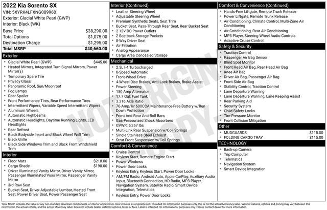 The Sorento SX also prioritizes your safety with an array of advanced driver assistance features, including Blind Spot Monitoring, Rear Cross-Traffic Alert, and Automatic Emergency Braking. With the Exterior Parking Camera Rear, you'll have added confidence when maneuvering in tight spaces.
