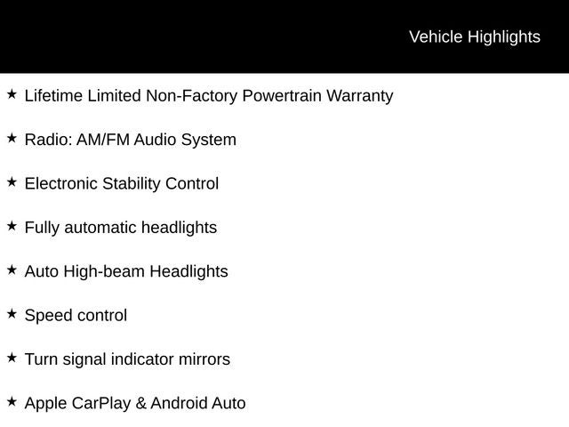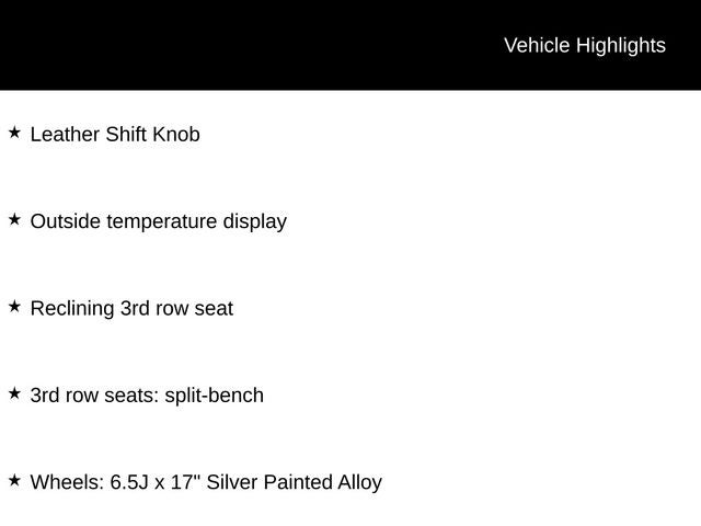 Lifetime Limited Non-Factory Powertrain Warranty, 3rd row seats: split-bench, Apple CarPlay & Android Auto, Auto High-beam Headlights, Electronic Stability Control, Fully automatic headlights, Leather Shift Knob, Outside temperature display, Radio: AM/FM Audio System, Reclining 3rd row seat, Speed control, Turn signal indicator mirrors, Wheels: 6.5J x 17 Silver Painted Alloy.