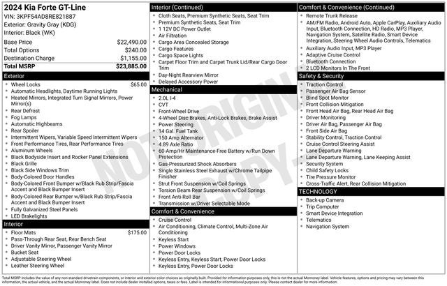 Beneath the sleek and aerodynamic exterior, the 2024 Forte GT-Line is powered by a 2.0L I4 MPI engine, delivering an impressive blend of efficiency and responsiveness. With an EPA-estimated 28 city/39 highway MPG, this Kia offers exceptional fuel economy, allowing you to go further between fill-ups.