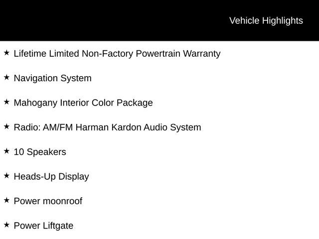 Lifetime Limited Non-Factory Powertrain Warranty, 10 Speakers, Active Cruise Control, Apple CarPlay & Android Auto, Auto High-beam Headlights, Auto-dimming Rear-View mirror, Electronic Stability Control, Exterior Parking Camera Rear, Garage door transmitter: HomeLink, Heads-Up Display, Heated & Ventilated Front Bucket Seats, Heated steering wheel, Mahogany Interior Color Package, Navigation System, Power Liftgate, Power moonroof, Radio: AM/FM Harman Kardon Audio System, Wheels: 20 x 7.5 Black Finish.