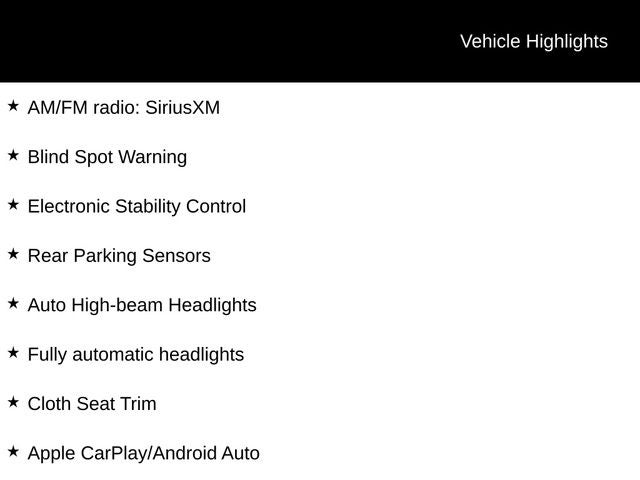 AM/FM radio: SiriusXM, Apple CarPlay/Android Auto, Auto High-beam Headlights, Blind Spot Warning, Cloth Seat Trim, Electronic Stability Control, Fully automatic headlights, Rear Parking Sensors, Wheels: 17 Alloy (5-Hole).