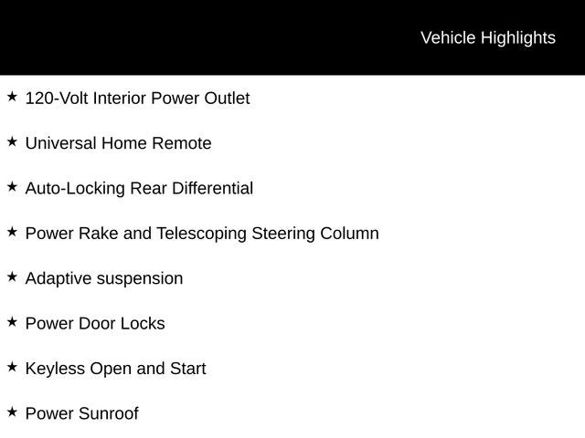 - LED Cargo Area Lighting located in cargo bed activated with switch on center switch bank or key fob